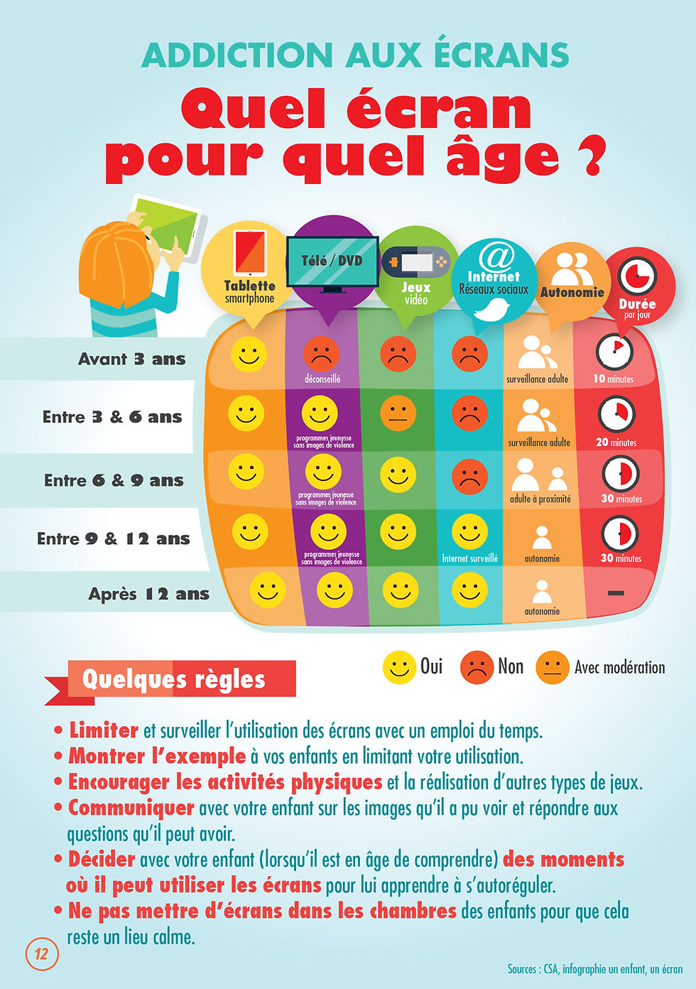 L'importance des interactions : ce conseil s'adresse plus spécifiquement aux parents de jeunes enfants mais également aux autres. On ne livre pas l'enfant seul face à l'image. On commente. On discute de ce qu'on voit, de ce qui se passe, de ce qu'on fait. On accompagne son petit dans l'utilisation des tablettes ou applications. L'utilisation des écrans doit demeurer une occasion de langage et un support d'apprentissage.